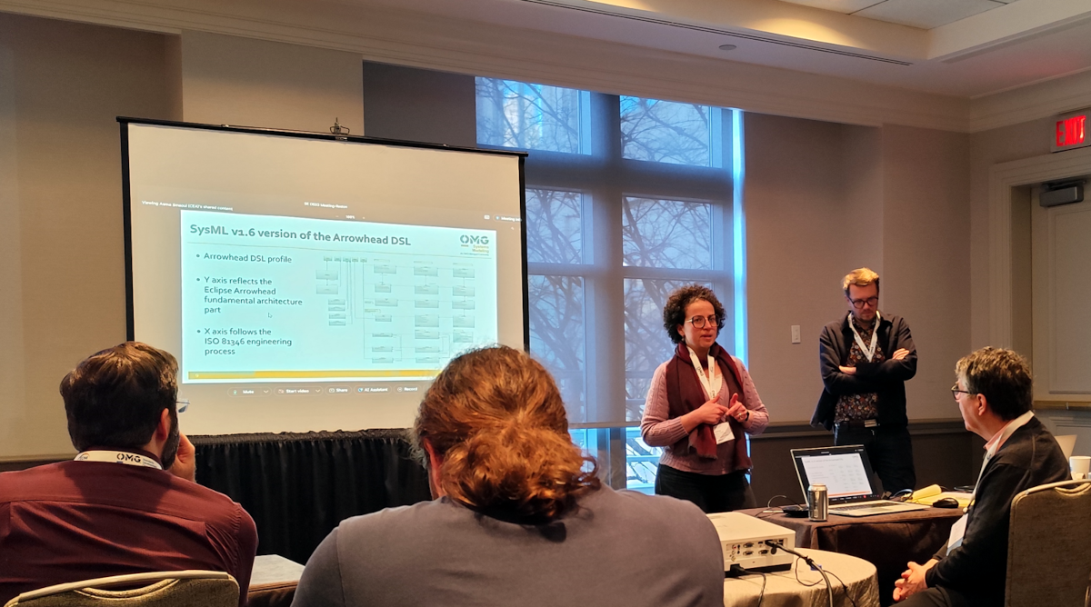 At the OMG technology meeting in Reston, Asma Smaoui (CEA), Jerker Delsing (LTU), and Géza Kulcsár (PTC) presented ongoing work on the ‘SysMLv2 library for SOA’, based on MBSE activities in the Arrowhead fPVN and AIMS5.0 projects. The resulting Arorwhead DSL (Domain Specific Language) is applicable to integration of AI and automation into production and products.